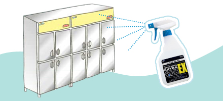 高機能アルカリ電解水の除菌能力とグレープフルーツシードエクストラクトの抗酸化能力のダブル作用により、電解水単体よりも高い洗浄・除菌・抗菌効果を発揮します。またEXは無臭であり、現場や食材への洗浄臭移りも無く、誤って食材に掛かっても安全無害でありますことから、冷蔵庫内やショーケース、調理台その他キッチン全般における洗浄・除菌・抗菌・消臭作業に最適です。